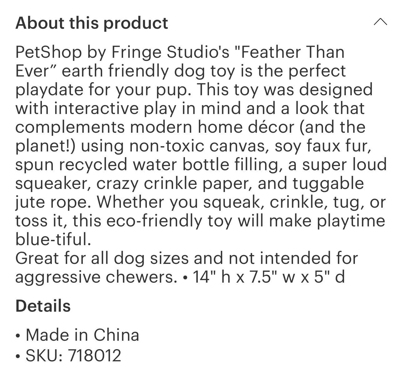 PetShop by Fringe Studio's "Feather Than Ever" earth friendly dog toy is the perfect playdate for your pup. This toy was designed with interactive play in mind and a look that complements modern home décor (and the planet!) using non-toxic canvas, soy faux fur, spun recycled water bottle filling, a super loud squeaker, crazy crinkle paper, and tuggable jute rope. Whether you squeak, crinkle, tug, or toss it, this eco-friendly toy will make playtime blue-tiful.