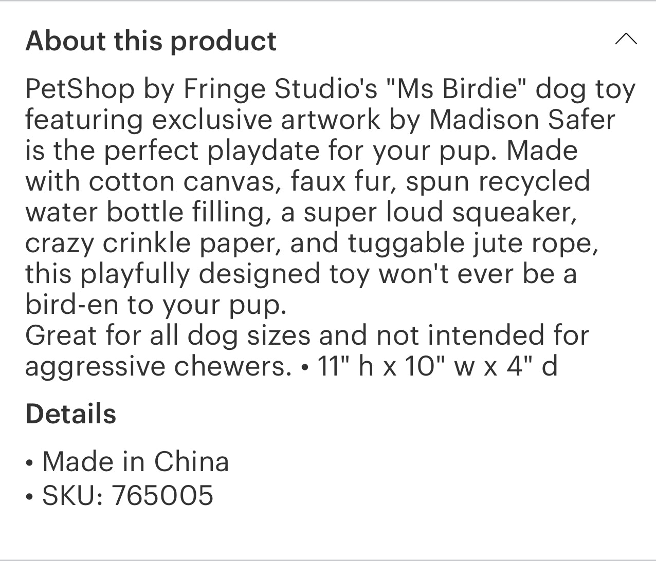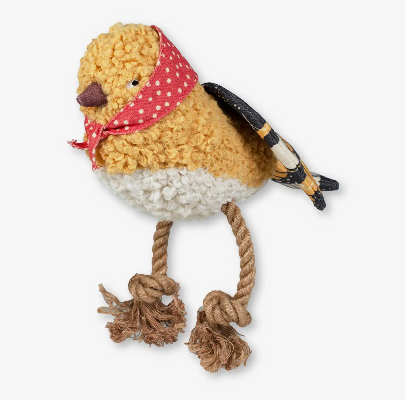 PetShop by Fringe Studio's "Ms Birdie" dog toy featuring exclusive artwork by Madison Safer is the perfect playdate for your pup. Made with cotton canvas, faux fur, spun recycled water bottle filling, a super loud squeaker, crazy crinkle paper, and tuggable jute rope, this playfully designed toy won't ever be a bird-en to your pup.
