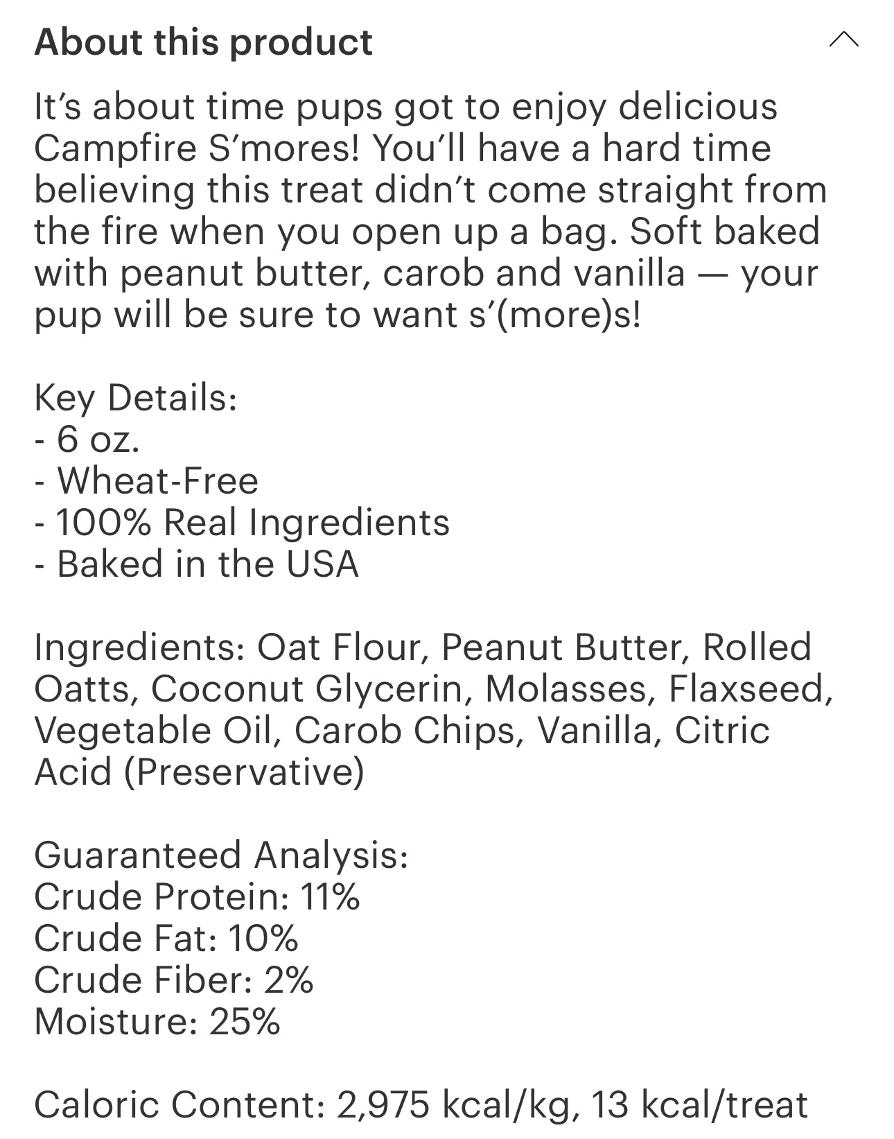 It's about time pups got to enjoy delicious Campfire S'mores! You'll have a hard time believing this treat didn't come straight from the fire when you open up a bag. Soft baked with peanut butter, carob and vanilla — your pup will be sure to want s'(more)s!