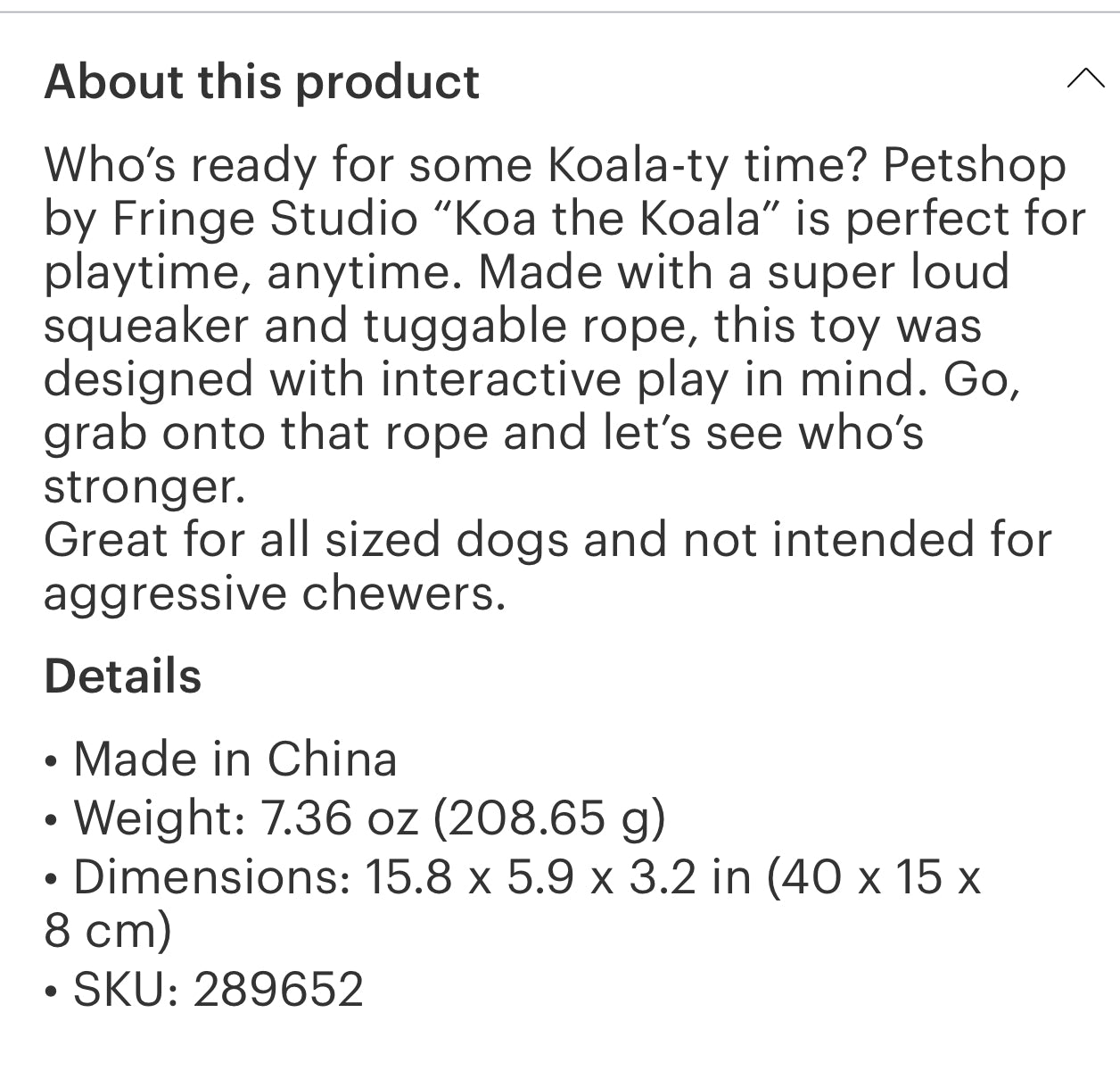 Who's ready for some Koala-ty time? Petshop by Fringe Studio "Koa the Koala" is perfect for playtime, anytime. Made with a super loud squeaker and tuggable rope, this toy was designed with interactive play in mind. Go, grab onto that rope and let's see who's stronger.